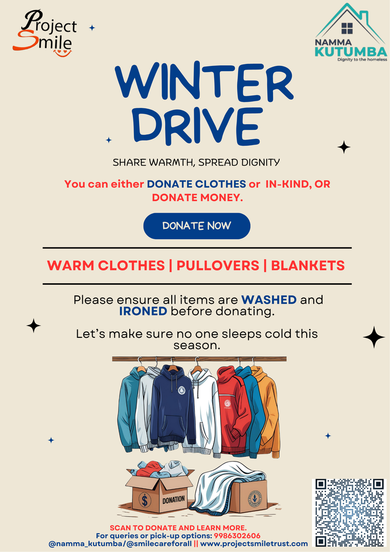 As temperatures dip, countless individuals living in vulnerable conditions struggle to stay warm. At Namma Kutumba and Project Smile, we believe that warmth is not a luxury—it’s a basic need. Through this Winter Drive, we are collecting washed and ironed warm clothes, pullovers, and blankets for families and individuals in need.
