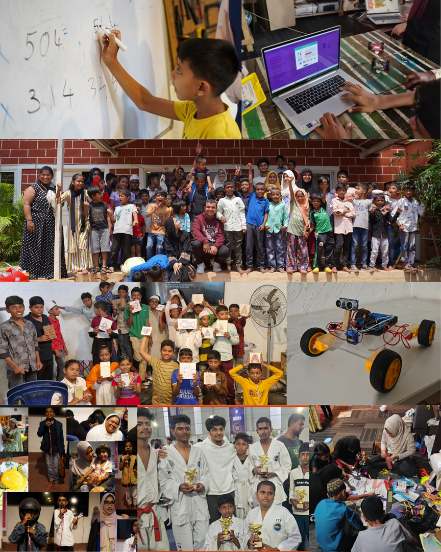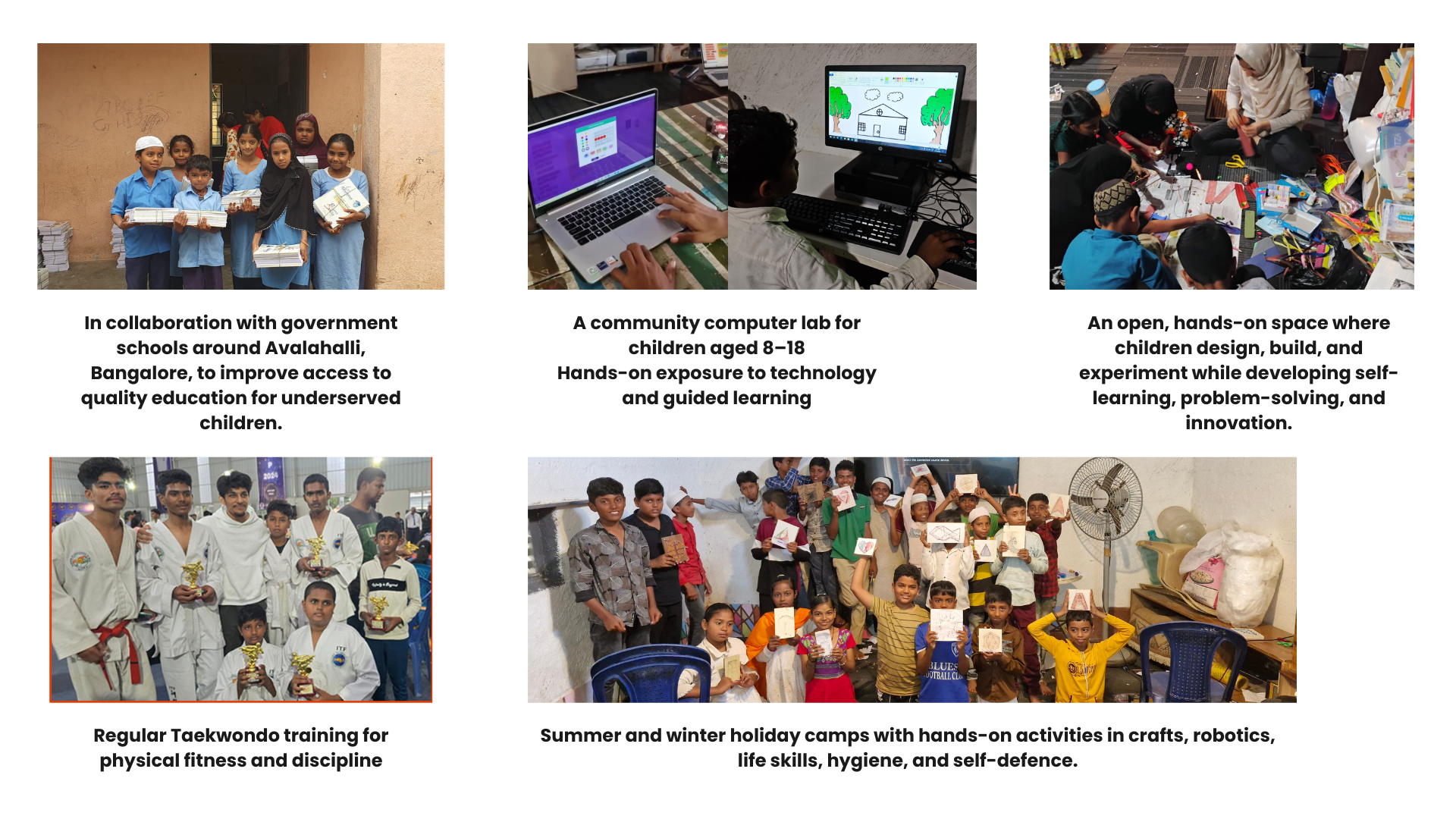 ₹10,000/month supports learning materials, computers, maker tools, and digital & English education.